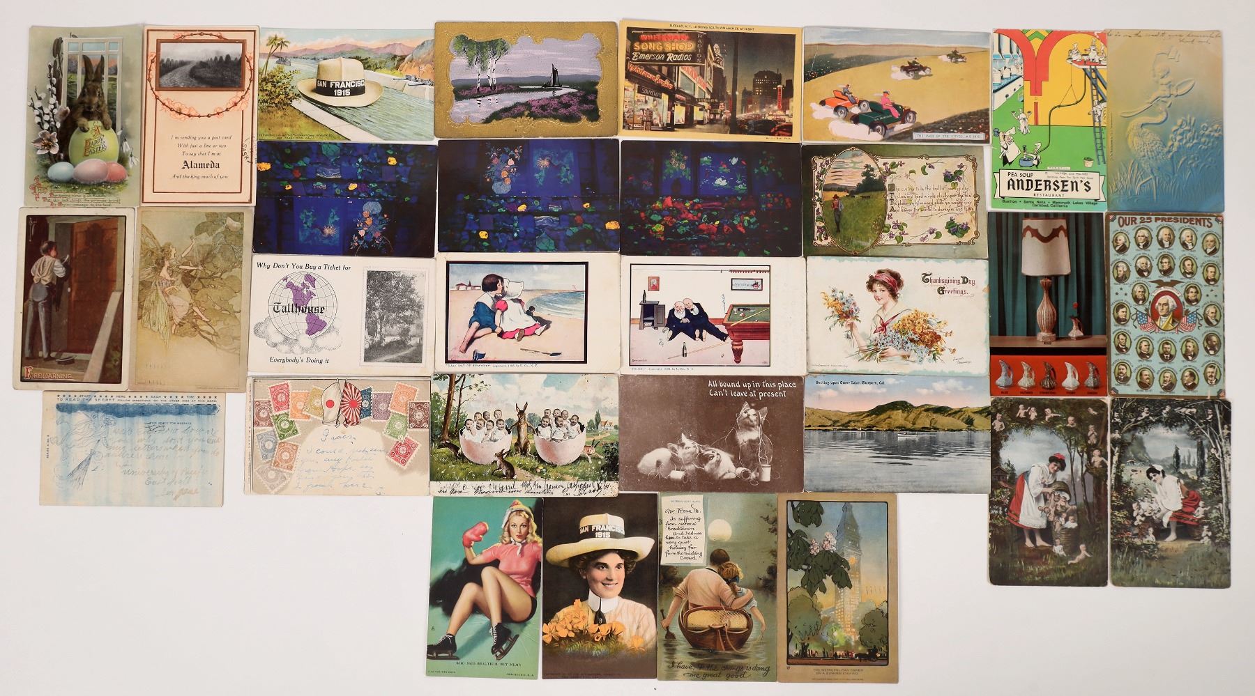 Lot of 31. Greeting cards from around the U.S. includes children kittens, U.S> Presidents,Easter Bunny, one souvenir 1915 Pan Pac Expo card. Post marks: McKinleyville, Ca., Freshwater Ca., Denver, Iowa Park Tex., San Jose Ca., Butte Mont., N.Y., Heron Mont., and several foreign postmarks 1905-17 Ken Prag Collection