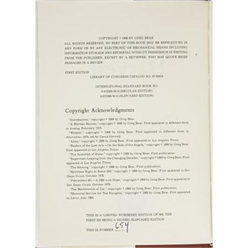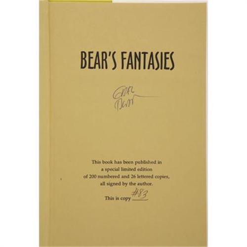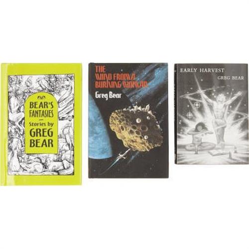 <B>Greg Bear</B></I>. <B>Three Limited First Editions, Two Signed</B></I>, including: <B><I>The Wind from a Burning Woman</B></I></B></I>. [Sauk City, Wisconsin]: Arkham House, 1983. Number 160 of 250 copies. Inscribed and signed by the author on the title page. A bookplate, signed by Bear and illustrator Dennis Neal Smith is affixed to the front endpaper. Octavo. 270 pages. Black cloth with gold spine titles. Overall, very fine. [and:] <B><I>Early Harvest</B></I></B></I>. Cambridge, Massachusetts: NEFSA Press, 1988. Number 654 of 800 copies. Twelvemo. 131 pages. Red cloth with gold titles on spine and front cover. Fine. [and:] <B><I>Bear's Fantasies</B></I></B></I>. Newark, NJ: The Wildside Press, 1992. Number 83 of 200 copies. Signed by the author on the limitation page. Yellow cloth with silver spine titles. Overall, book and dust jacket are very fine. <I>From the Robert and Diane Yaspan Collection.</B></I><BR><BR><b>Shipping:</b> Books & Catalogs (<a target="_blank" href="http://www.heritageauctions.com/common/shipping.php">view shipping information</a>)