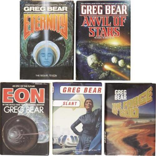 <B>Greg Bear</B></I>. <B>Five Science-Fiction First Editions</B></I>, including: <B><I>Eon</B></I></B></I>. New York: Bluejay Books, Inc., 1985. Octavo. 504 pages. Black cloth with silver spine titles. [and:] <B><I>The Forge of God</B></I></B></I>. New York: Tom Doherty Associates, 1987. Octavo. 473 pages. Black cloth with gold spine titles. [and:] <B><I>Eternity</B></I></B></I>. New York: Warner Books, Inc., 1988. Octavo. 399 pages. Quarter-bound with black cloth spine and yellow paper on boards. Gold spine titles. [and:] <B><I>Anvil of Stars</B></I></B></I>. New York: Warner Books, Inc., 1992. Octavo. 434 pages. Quarter-bound with red spine and blue paper on boards. [and:] <B><I>Slant</B></I></B></I>. New York: Tom Doherty Associates, 1997. Octavo. 395 pages. Blue binding with silver spine titles. Overall, books and dust jackets are fine. <I>From the Robert and Diane Yaspan Collection.</B></I><BR><BR><b>Shipping:</b> Books & Catalogs (<a target="_blank" href="http://www.heritageauctions.com/common/shipping.php">view shipping information</a>)