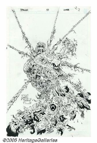 <B>Greg Capullo and Todd McFarlane - Spawn #41 Cover Original Art (Image, 1996).</B></I> Minions of the Curse get to the heart of the matter, in this carcinogenic creation by penciler Greg Capullo and inker Todd McFarlane. Spawn's body is literally being torn to shreds in this finely detailed cover illustration for <B>Spawn</B></I> #41. The image area measures 10" x 15" and the art is in Excellent condition.