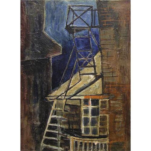 Canadian [1936-1992] THE FIRE-ESCAPE; ca 1956 16 x 12 in. (40.6 x 30.5 cm) oil on masonite Provenance: Estate of the artist Note: Estate authentication verso
