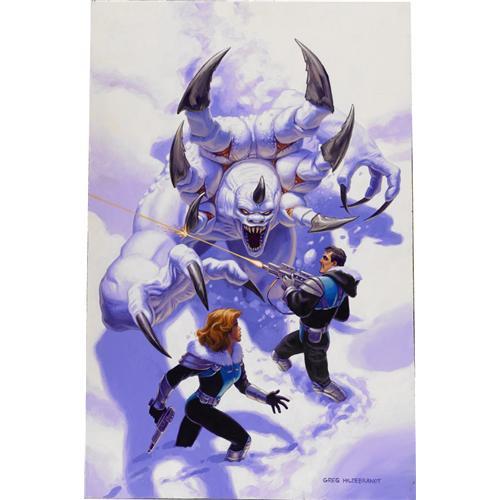 <B>Greg Hildebrandt - Gatecrasher #4 Cover Original Art (Black Bull, 2000).</B></I> A senses-shattering snow beast like this fellow certainly is a far cry from your friendly neighborhood Frosty the Snowman! The offbeat <B>Gatecrasher</B></I> series ran only four issues; #4 featured this hypothermic hullabaloo from Greg Hildebrandt. <B>Gatecrasher </B></I> featured the story of Alec Wagner, a college student who is half-human, half alien and a member of the Split-Second Squad, a secret alien army that protects Earth from alien attacks through interdimensional gates. This acrylic on board painting measures an overall 23" x 35", and the art is in Excellent condition. Signed at the lower right.<BR><BR><b>Shipping:</b> Flat Material, Large (<a target="_blank" href="http://www.heritageauctions.com/common/shipping.php">view shipping information</a>)