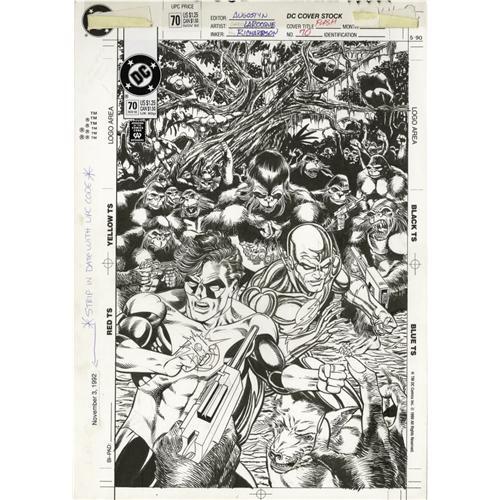 <B>Greg LaRocque and Roy Richardson - Flash #70 Cover Original Art (DC, 1992).</B></I> Surrounded by an army of apes intent on world domination, Wally West and Hal Jordan find themselves in a "hairy" situation deep in the heart of Gorilla City, in this cover illustration. The image area measures 10" x 15", and the art includes the original title type and masthead paste-up art. In Excellent condition. <BR><BR><B>Important notice:</B> Heritage usually auctions material at the rate of 200-250 lots per hour. On some occasions eBay Live bid software or the Internet may not be able to keep up with the pace of the auction. We recommend placing a realistic absentee bid now as insurance to avoid disappointment. Occasionally the auctioneer may eliminate or reject an eBay Live bid, and the auctioneer may also reopen a lot after the close of the eBay live bidding (usually because we missed an audience bid), and may reject your bid even if it shows you as the winning bidder. By bidding via eBay Live, you agree that Heritage may award the lot to another bidder at its sole discretion under the circumstances described above or any other reasonable circumstances. Since eBay bids are not shown to us until we open the lot on the floor, we treat those bids just like floor bids. In most cases the floor responds before the eBay bid is presented to us, due to Internet lag time, so for consistency we have made it a policy that floor bids are always considered first over tie eBay live bids. Also please note that all Heritage lots purchased through eBay Live carry a 22.5% Buyer's Premium. Please make sure you read the Terms and Conditions before you bid. This lot is being auctioned in conjunction with a live floor auction by Heritage Auction Galleries. All final auction and invoice information will be supplied by Heritage Auction Galleries, and all other information should be considered preliminary. Lot:41001 <BR><BR><B>Winning Notification and Billing:</B> After the FINAL session in this auction is complete, Heritage will send e-mail and snail mail invoices. This process normally takes several days. All final auction and invoice information will be supplied by Heritage Auction Galleries, and all other information should be considered preliminary. <BR><BR>This auction will be conducted on a live auction floor and over the Internet through eBay Live. If you choose to place an absentee bid, please take a moment to <font color='#0000ff'><u><a href='http://pages.ebay.com/liveauctions/help/before/laabsentee.html'>learn how eBay Live absentee bidding works</a></u></font><font color='#000000'>
