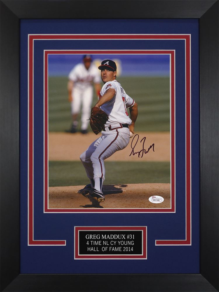 A beautifully Framed Autographed Greg Maddux Atlanta Braves Photo. The Autographed Photo is certified by JSA and includes a sticker on the Photo and a matching certificate attached to the back of the frame.