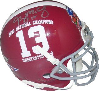Greg McElroy was the starting quarterback for the Crimson Tide football team. As a junior, he led the Crimson Tide to an undefeated 14–0 season, which included the 2009 SEC Championship and BCS National Championship. Greg McElroy has hand signed this 2009 Alabama Crimson Tide Authentic Schutt Mini Helmet National Champs #13 Logo (BCS Logo on Front and Season Scores on Back). McElroy Hologram and Certificate of Authenticity from Athlon Sports. Private Signing 1/28/12, Huntsville, Alabama.