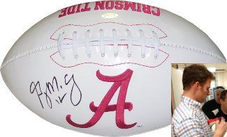 Greg McElroy was the starting quarterback for the Crimson Tide football team. As a junior, he led the Crimson Tide to an undefeated 14–0 season, which included the 2009 SEC Championship and BCS National Championship. Greg McElroy has hand signed this Alabama Crimson Tide Logo Football. Private Signing, 2/23/2013 in Hoover, AL. Photo of the Signing, McElroy Hologram and Certificate of Authenticity from Athlon Sports.