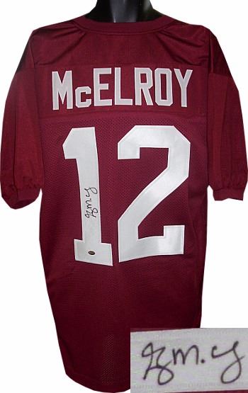 Greg McElroy was the starting quarterback for the Crimson Tide football team. As a junior, he led the Crimson Tide to an undefeated 14–0 season, which included the 2009 SEC Championship and BCS National Championship. Greg McElroy Alabama Crimson Tide has hand signed this Maroon unlicensed custom-prostyle jersey with twill stitched nameplate and numbers. McElroy Hologram and Certificate of Authenticity from Athlon Sports.