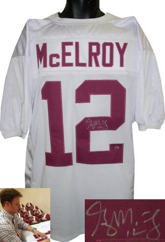 Greg McElroy was the starting quarterback for the Crimson Tide football team. As a junior, he led the Crimson Tide to an undefeated 14–0 season, which included the 2009 SEC Championship and BCS National Championship. Greg McElroy has hand signed this Alabama Crimson Tide White Custom Jersey. Private Signing, 2/23/2013 in Hoover, AL. Photo of the Signing, McElroy Hologram and Certificate of Authenticity from Athlon Sports.