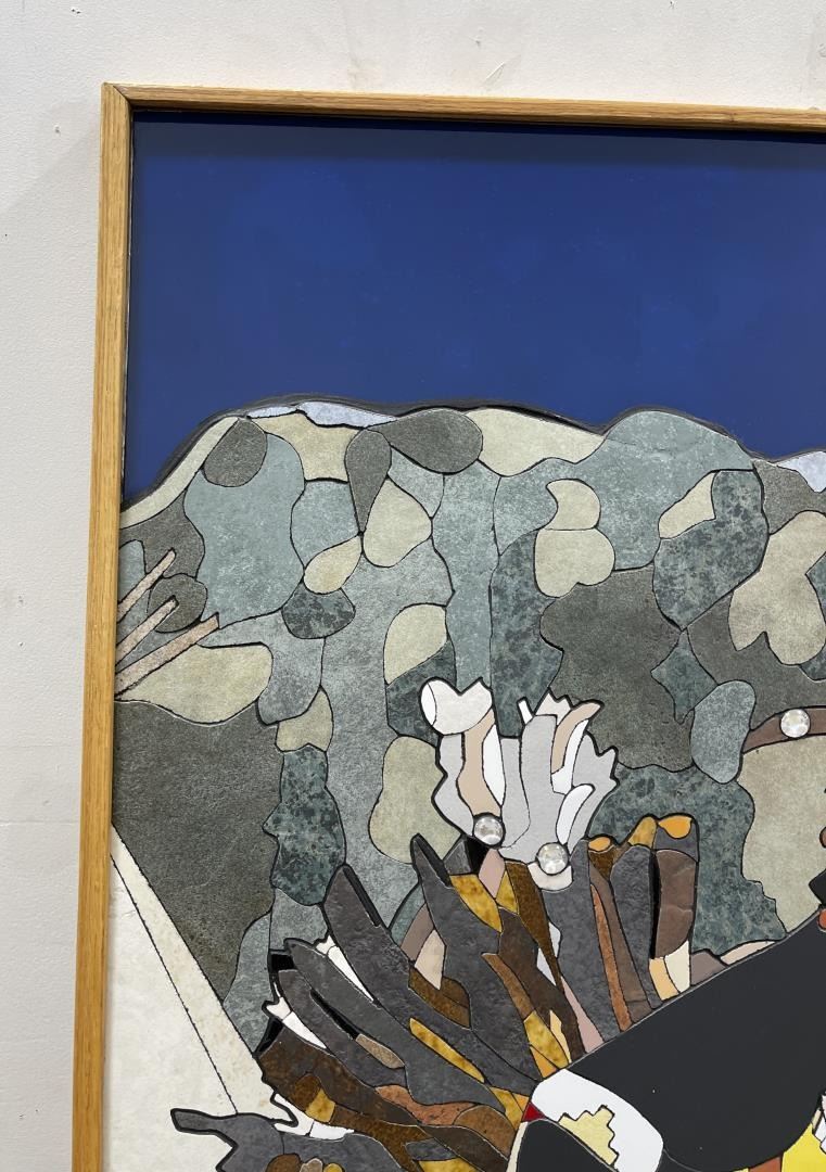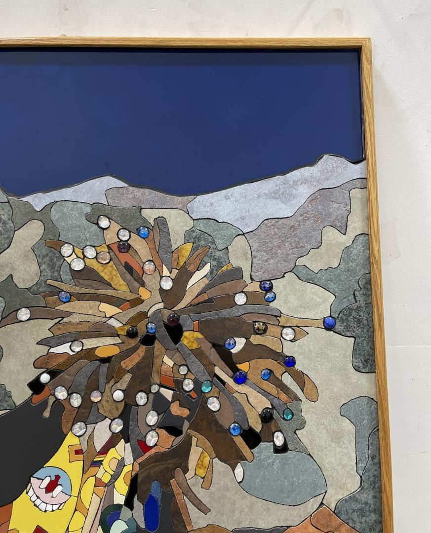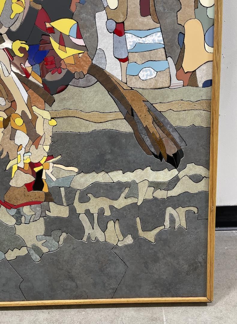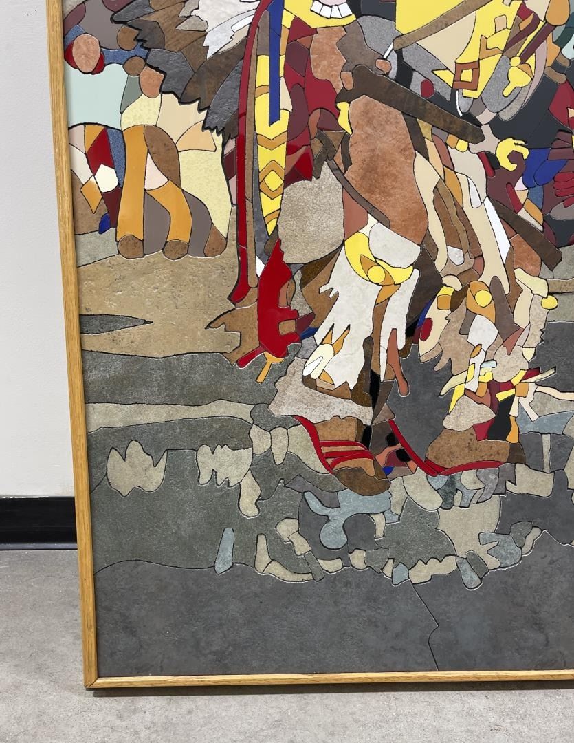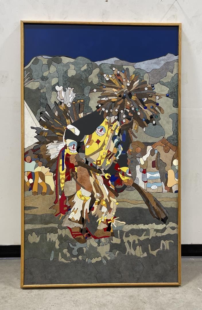 Title is Home of the Brave. This piece was hung and displayed in the governors office in Montana. The image was inspired by a photo of the 1991 Fort Missoula Powwow. This Mosaic has a well documented past and I have attached newspaper articles related to it as shown. 37 1/4" by 61 1/2" framed. Will be expensive to ship.