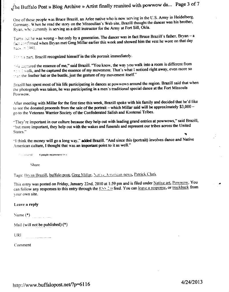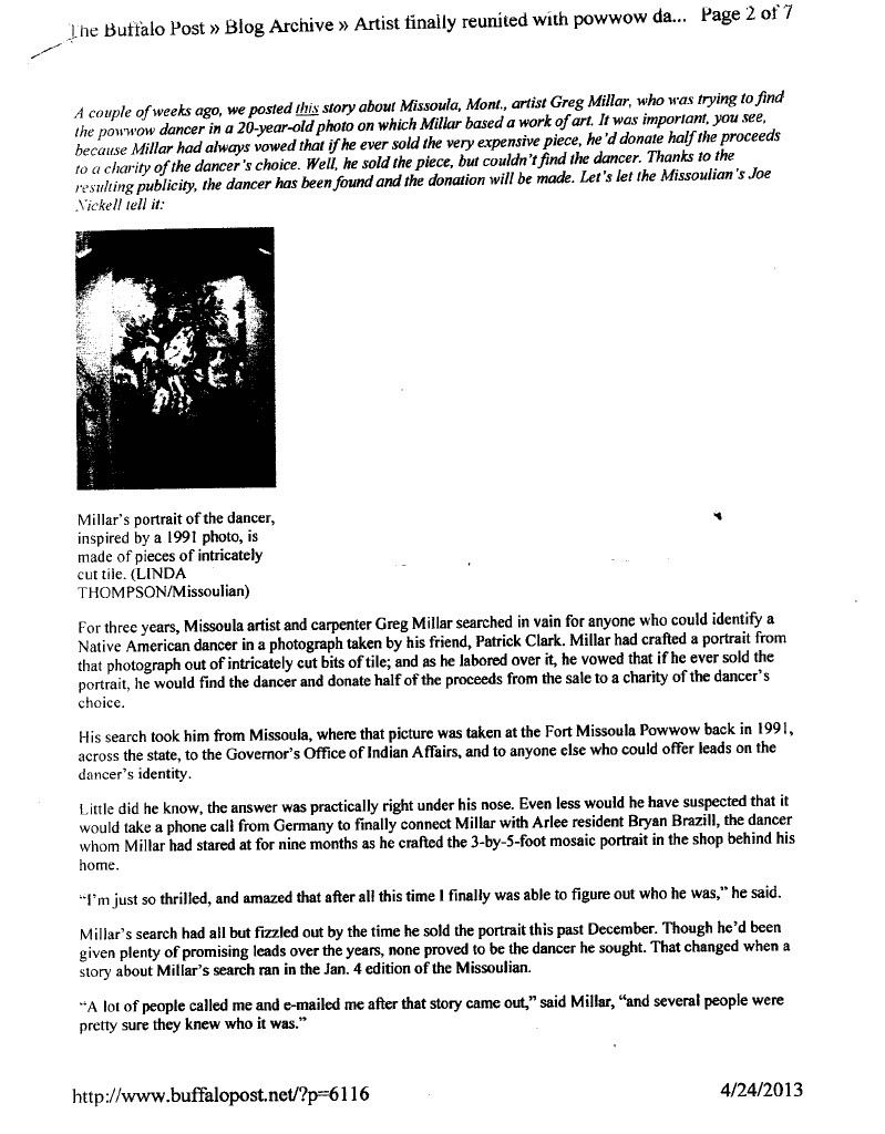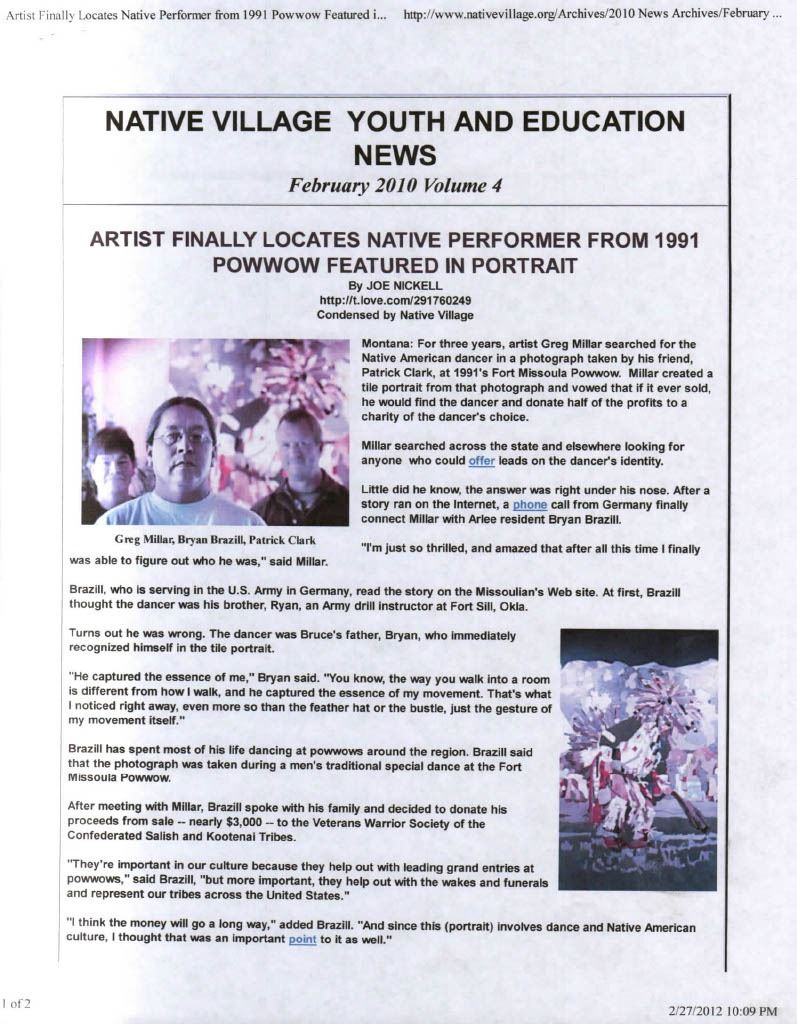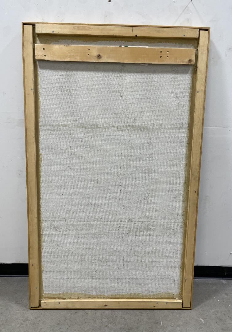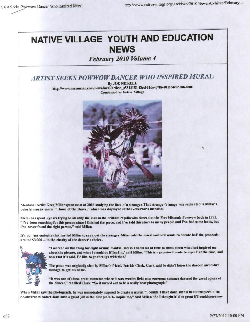 Title is Home of the Brave. This piece was hung and displayed in the governors office in Montana. The image was inspired by a photo of the 1991 Fort Missoula Powwow. This Mosaic has a well documented past and I have attached newspaper articles related to it as shown. 37 1/4" by 61 1/2" framed. Will be expensive to ship.