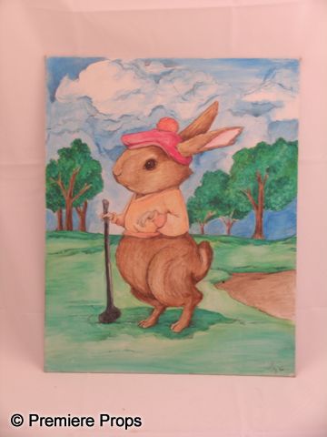 Bringing a humorous eye to golf, Greg Platt depicts a rabbit enjoying a day on the course. The Disney artist shows the bunny staring frame left, wearing an orange sweater and a red speed cap (his ears poking out of the top), and holding a driver. Detailed trees make up the background, creating a great frame-within-a-frame, highlighting the absurdity of the rabbit enjoying the pastime. (Measures approx. 16" x 20")