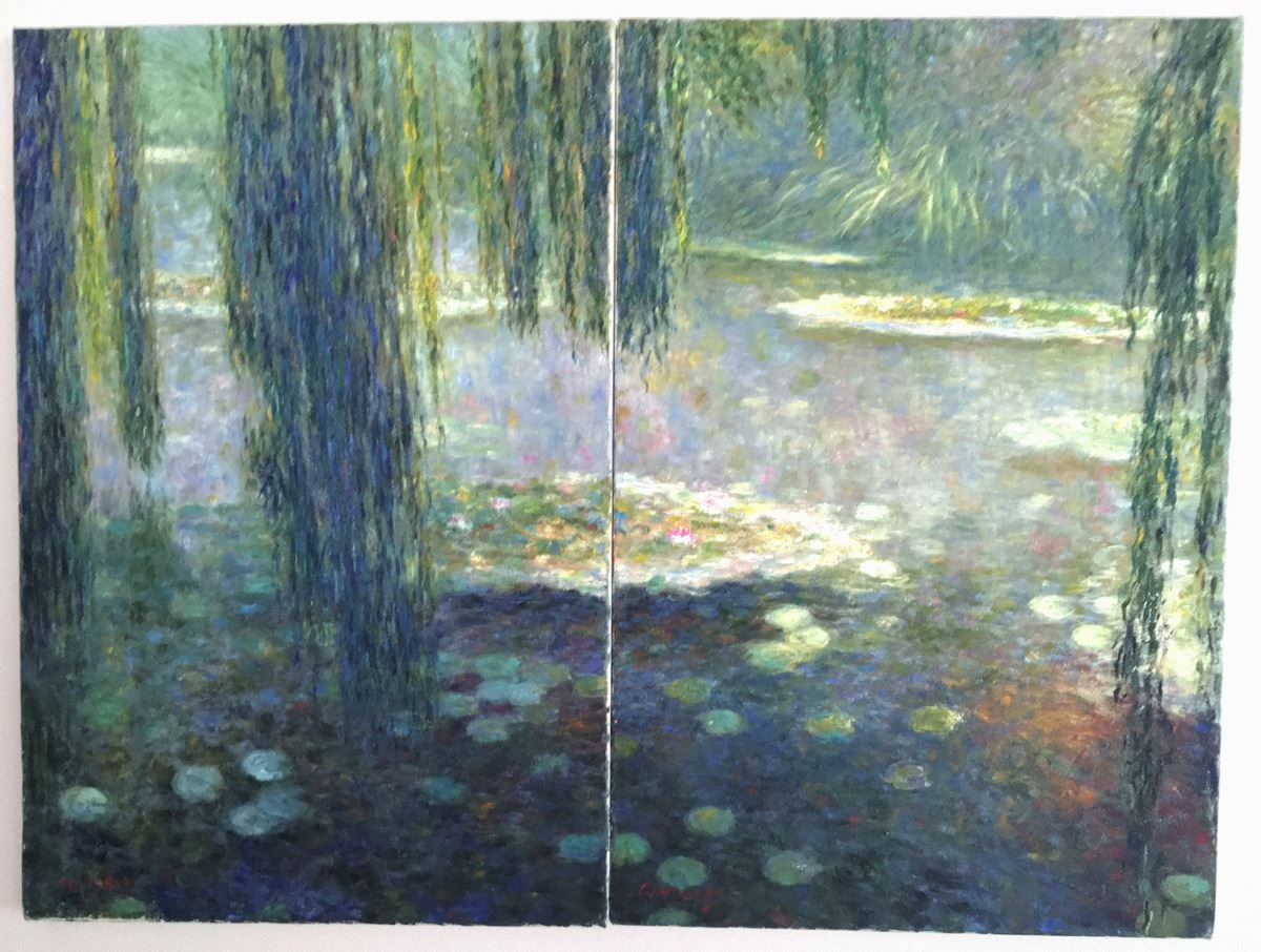 This is a dyptich from a series of three . We are selling two oil canvases each 36x24", stretched and Gallery-wrapped . Can be displayed unframed or in framing. Greg singley is a master Impressionist whose skillful original paintings have been featured by Galleries from NY to Chicago .
