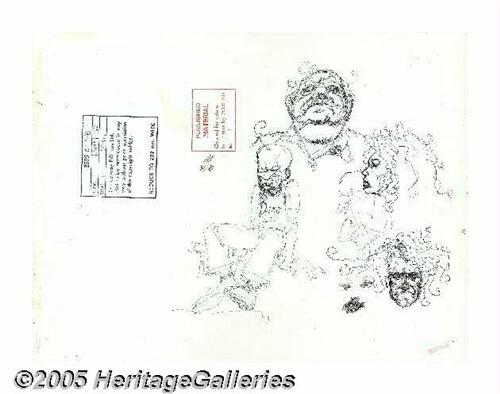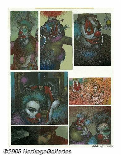 <B>Greg Staples - 2000 A.D. Yearbook, "The Clown," page 52 Original Art (Fleetway, 1994).</B></I> This dark and disturbing scene spotlighting killer clowns reveals a dark side of the carnival tricksters. The mixed-media on paper "monster-piece" has an image area of 12.5" x 17", and the art is in Excellent condition. As an art bonus, the back of the paper has several detailed ink sketches.