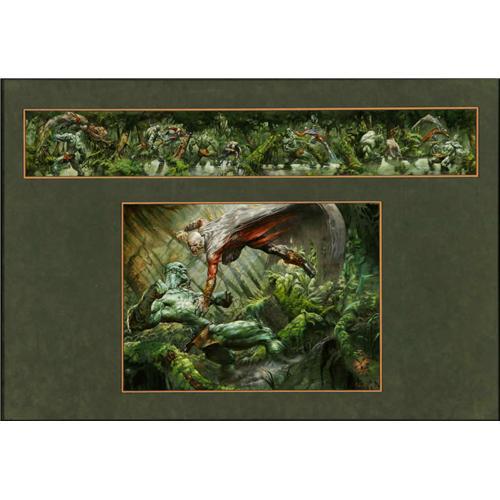 <B>Greg Staples - "Swamp Thing versus Demon" Painting Original Art (undated).</B></I> It's a real rumble in the swamplands as Swamp Thing battles Etrigan, the Demon, with no holds barred. Internationally known artist, painter, and designer, Greg Staples, has contributed to <B>2000 AD</B></I>, <B>Green Lantern</B></I>, <B>Swamp Thing</B></I>. He has also created concept and production art for <B>Magic the Gathering</B></I>. Two scenes are matted one atop the other to make for a spectacular showpiece. The scene on top has an image area of 28" x 4" , while the scene on the bottom has an image area of 16" x 12". The art was beautifully matted and framed and is in Excellent condition.