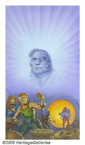 <B>Greg Theakston - "Exchameleon" Cover Original Art (St. Martins, 1988).</B></I> The first book in the <B>Exchameleon</B></I> series by comic historian Ron Goulart was graced with this colorful cover painting by Greg Theakston. Theakston has enjoyed a varied career in comics and illustration, working with the legendary Jack Kirby at the tail-end of his career, promoting obscure nostalgia in <B>The Betty Pages</B></I> magazine, and painting covers for a variety of books and magazines. This gorgeous piece is rendered in acrylic on illustration board, measures 22" x 14", and is signed lower left. In Excellent condition.