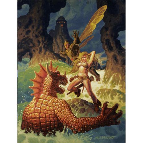 <B>Greg and Tim Hildebrandt - Battle with Red Sea Beast Painting Original Art (1982).</B></I> The Brothers Hildebrandt exploded onto the public scene in 1978 when their poster painting for "Star Wars" became etched into the memories of millions of fans. Known individually for their fantasy and science fiction paintings, the Hildebrandts have created fantastic images for <B>Omni</B></I>, <B>Heavy Metal</B></I>, Marvel and dozens of other entertainment companies. A bronze skinned beauty stands defiantly against a monstrous denizen of the deep, in an alien landscape bathed in that gloriously mesmerizing Hildebrandt light, in this masterpiece created for <B>The Brothers Hildebrandt Atlantis Calendar</B></I>, which was published in 1982. This art was also included as a card in the 1994 The Brothers Hildebrandt trading card set, published by Comic Images. This unforgettable image was painted in acrylics on a 27" x 36" sheet of masonite, and is in Excellent condition.