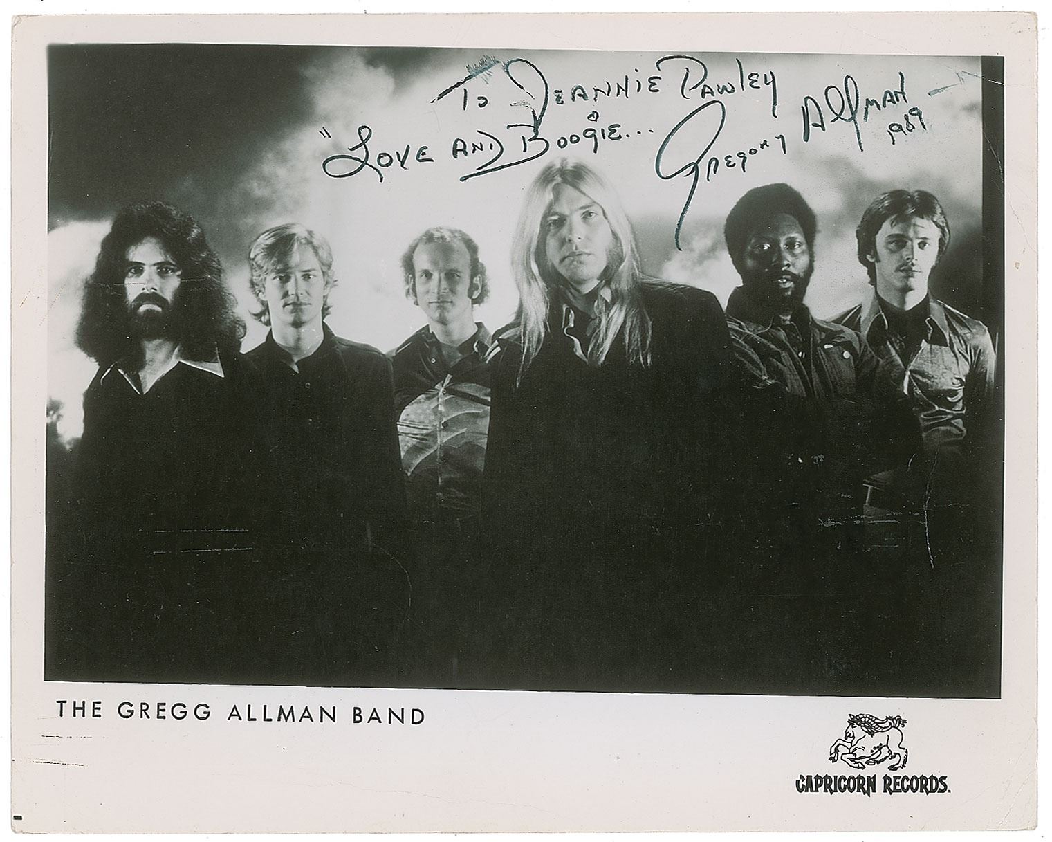 Uncommon glossy 10 x 8 Capricorn Records publicity for The Gregg Allman Band, signed and inscribed in black felt tip, "To Jeannie Pawley, 'Love and Boogie'…Gregory Allman—1989.” In very good condition, with a slight brush to the inscription, and creasing, primarily to the upper and lower right corners.