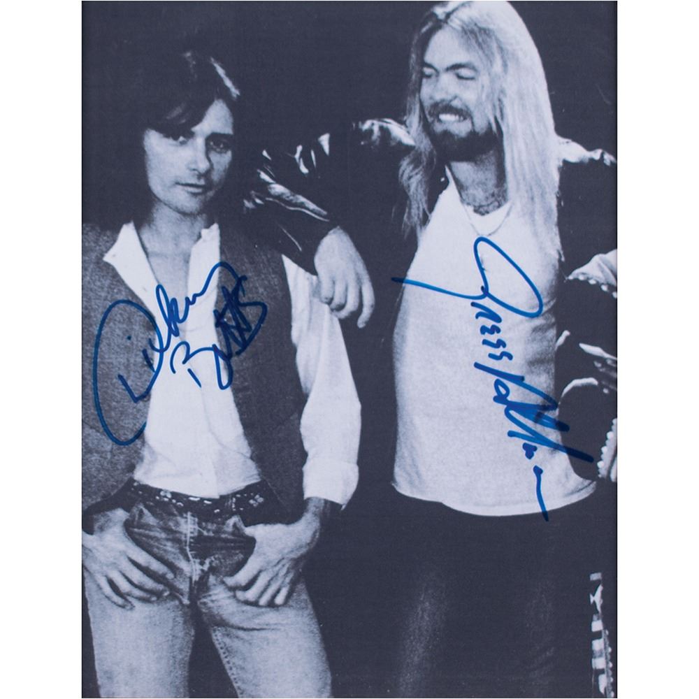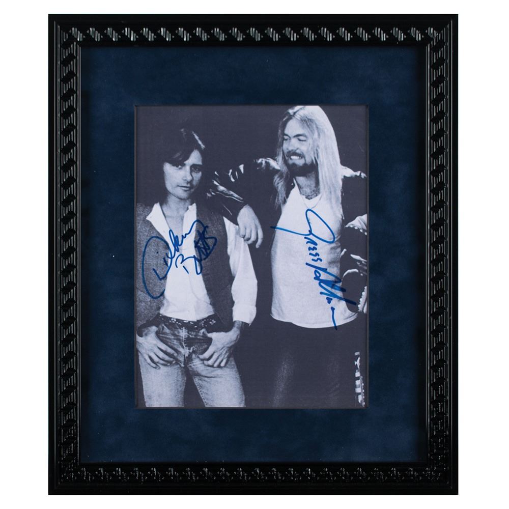 Semi-glossy 7.75 x 10.25 photo of Gregg Allman and Dickie Betts of the Allman Brothers, signed by both in blue felt tip. Matted and framed to an overall size of 14 x 16.25. In fine condition, with a few small creases. Accompanied by a full letter of authenticity from REAL.