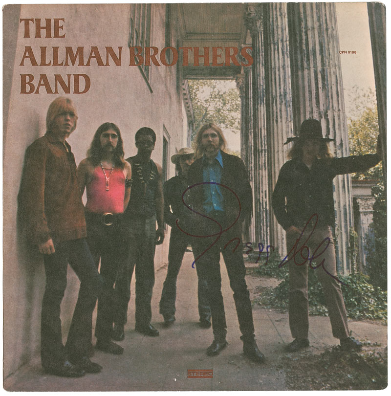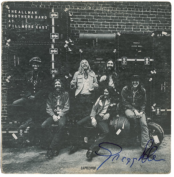 Two signed albums, The Allman Brothers Band and At Fillmore East, each signed on the front cover in blue felt tip by Gregg Allman. In fine condition, with light surface loss to the left edge of the self-titled album, more moderate paper loss to the left edge and corners of the At Fillmore East album, and a light ‘ring of wear’ to both sides of the latter album. Self-titled record is included.