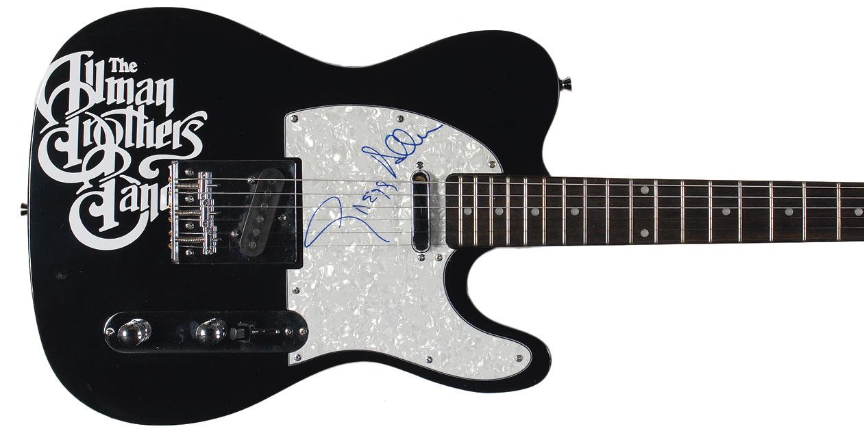 Black-bodied Stedman Pro ‘telecaster-style’ electric guitar, with the band’s name on the body, signed on the mother-of-pearl pickguard in blue felt tip. In fine condition. Oversized.