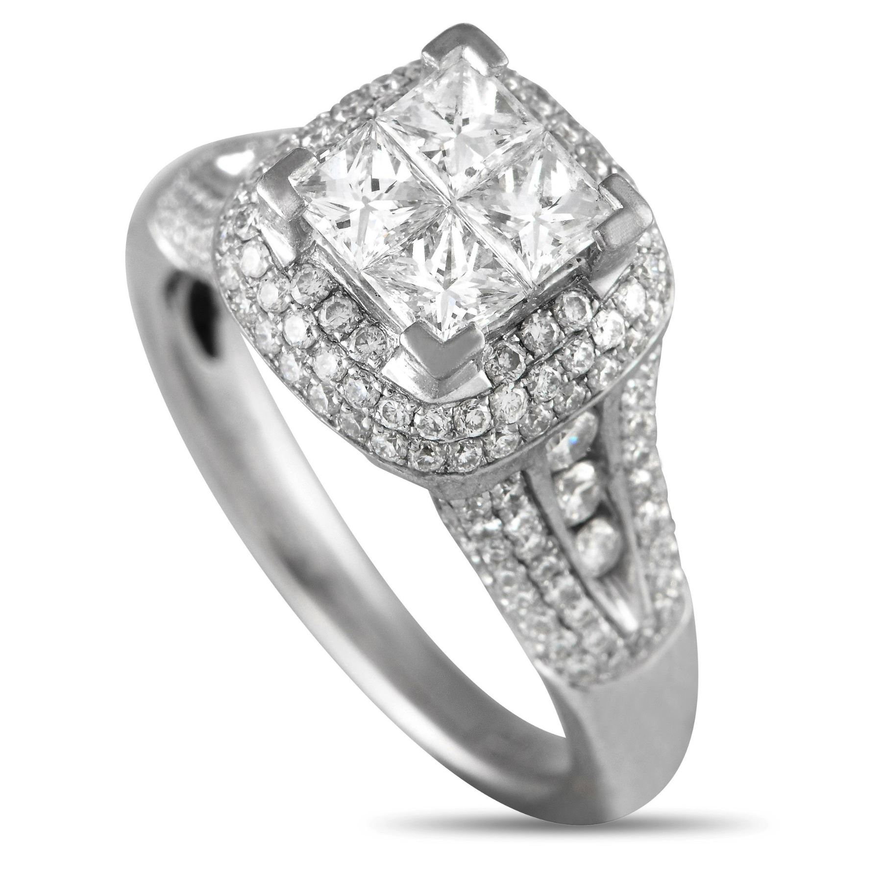 A dazzling arrangement of Diamonds with a total weight of 1.85 carats make this ring impossible to ignore. This pieces stunning 18K White Gold setting features a 1mm wide band and a bold 10mm top height. Total weight of ring 7.7 grams. Ring size is 6.5. This jewelry piece is offered in estate condition and includes a gift box.