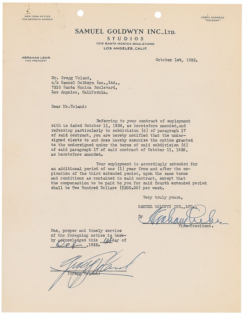Highly influential American cinematographer (1904-1948) noted for his innovative use of lighting and techniques such as deep focus, an example of which can be found in his work on Orson Welles's Citizen Kane. DS, one page, 8.5 x 11, October 1, 1932. Amendment to Toland’s 1928 Goldwyn Studios contract, extending his employment for one year at a rate of $200 per week. In fine condition, with a light crease to the bottom left, soiling and paperclip impressions to the upper left, and two punch holes to the top.