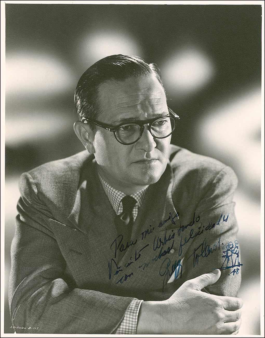 Highly influential American cinematographer (1904-1948) noted for his innovative use of lighting and techniques such as deep focus, an example of which can be found in his work on Orson Welles's Citizen Kane. Vintage matte-finish 8 x 10 photo, signed and inscribed in fountain pen in French and dated 1948, with Toland adding a small sketch under his signature. In fine condition.