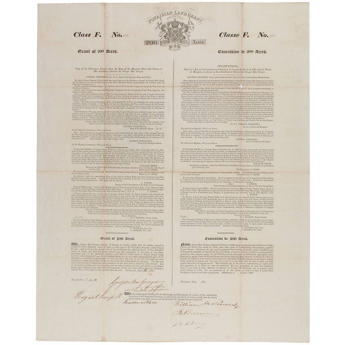 Scottish soldier, adventurer, land speculator, and charlatan (1786–1845) who fought in the South American struggle for independence but became best known for a real estate scam in which he sold land to hopeful colonists in a fictional Central American country called Poyais. Partly-printed DS in English and French, one page, 16 x 20, April 3, 1834. Two-language land grant by which MacGregor conveys two-hundred acres in Poyais to the purchaser for “one cent of a dollar per Acre annually, in the name of quit rent, on the twenty-fourth day of December in each year.” Crisply signed at the conclusion in black ink by MacGregor and countersigned by four of his associates. In very good condition, with intersecting folds with partial tape-repaired separations, toning along folds, and light soiling. MacGregor began this fraudulent scheme upon his return to London from South America in 1820. Throughout Great Britain and France, MacGregor was able to keep up his charade in varying capacities until 1837. As one of MacGregor’s phony land grants from the time he had expanded his operation into parts of Europe, this is a particularly intriguing piece.