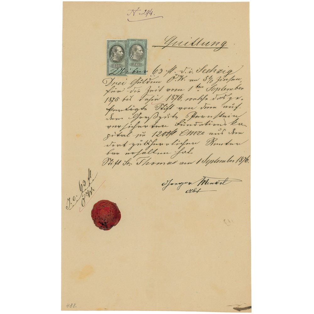 Rare autograph DS in German, signed "Gregor Mendel," one page, 8.25 x 13.5, September 1, 1876. Untranslated document concerning a financial transaction, issued from St. Thomas's Abbey in Brno. An official embossed red wax seal is affixed to the lower left, with two revenue stamps affixed near the top. Intersecting folds, light toning and soiling, and wrinkles to the upper right, otherwise fine condition.