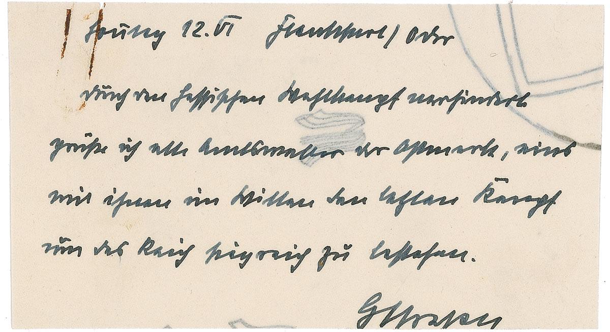 Head of Nazi political organization; second only to Hitler in power and authority. Hitler had him murdered in Berlin during the Night of the Long Knives. Handwritten welcoming address, in German, signed “G. Strasser,” on an off-white 4.75 x 2.75 sheet. Strasser writes (translated): “By preventing the Hessian election campaign, I greet all the officials sent by the eastern provinces, one with them in the will of the last battle for the kingdom are victorious.” In fine condition, with a light vertical crease, show-through from doodles on reverse, and a rusty paperclip mark to top left. RRAuction COA.