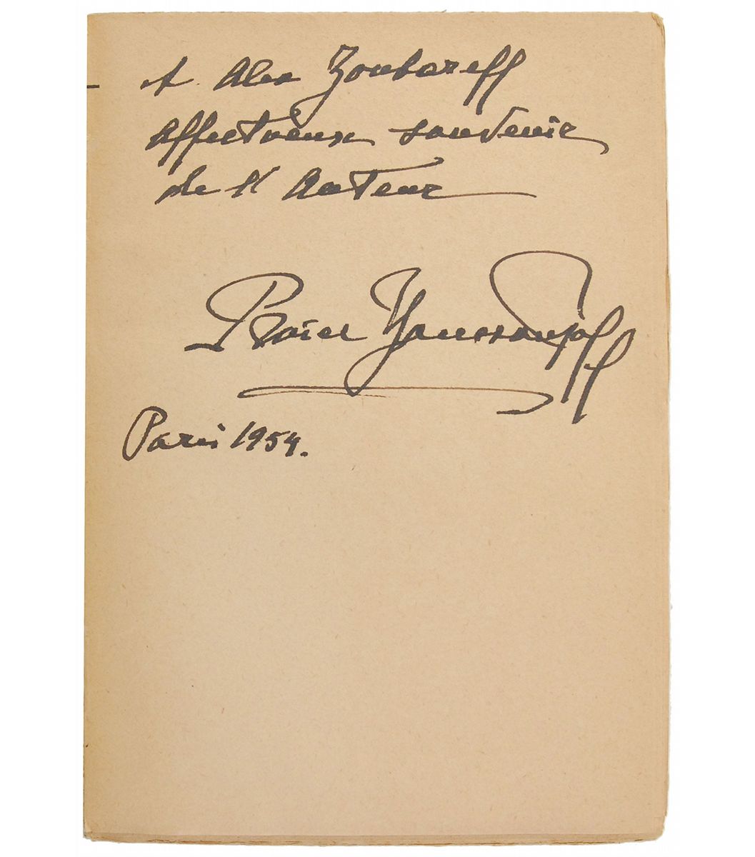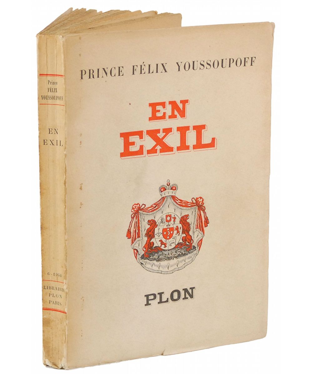 Russian aristocrat (1887–1967) best known for participating in the strange and storied assassination of Grigori Rasputin. Signed book: En Exil. Paris: Plon, 1954. Softcover, 5.75 x 8, 253 pages. Signed and inscribed on the first free end page in black ink, and dated 1954. Overall brittle toning and slight feathering to ink in the signature, otherwise fine condition.