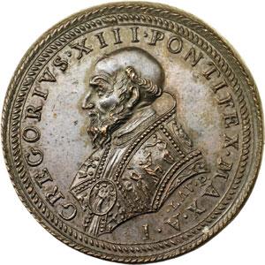 Una Collezione di Medaglie Papali. Gregorio XIII (1572-1585), Ugo Boncompagni. Medaglia A. I. Riconio. D/ Busto a sinistra con piviale. R/ Providentia. Spink 747. AE. mm. 36.00 Inc. Lorenzo Fragni. qFDC. Bustina dello Studio Numismatico Nic. Majer, Venezia.