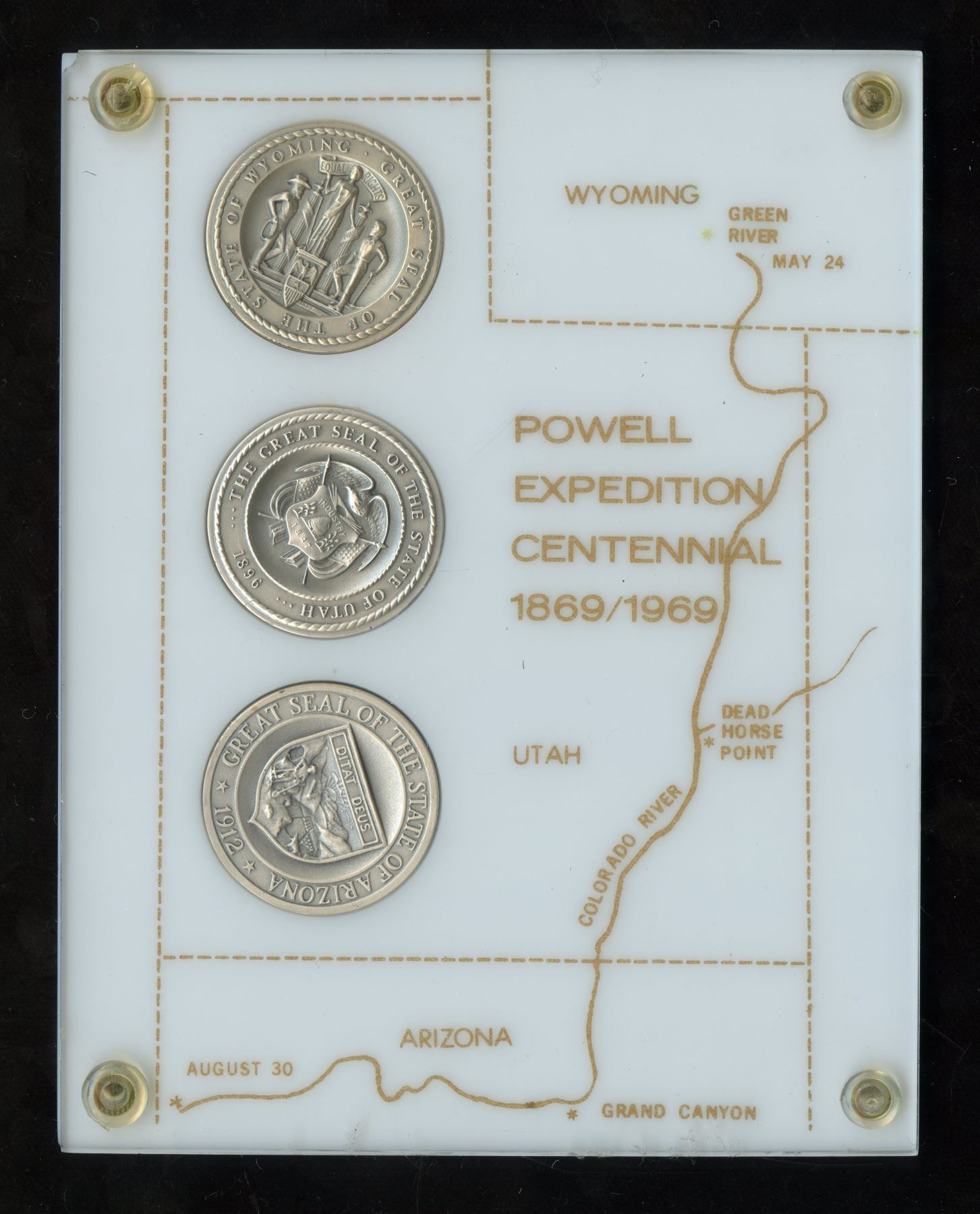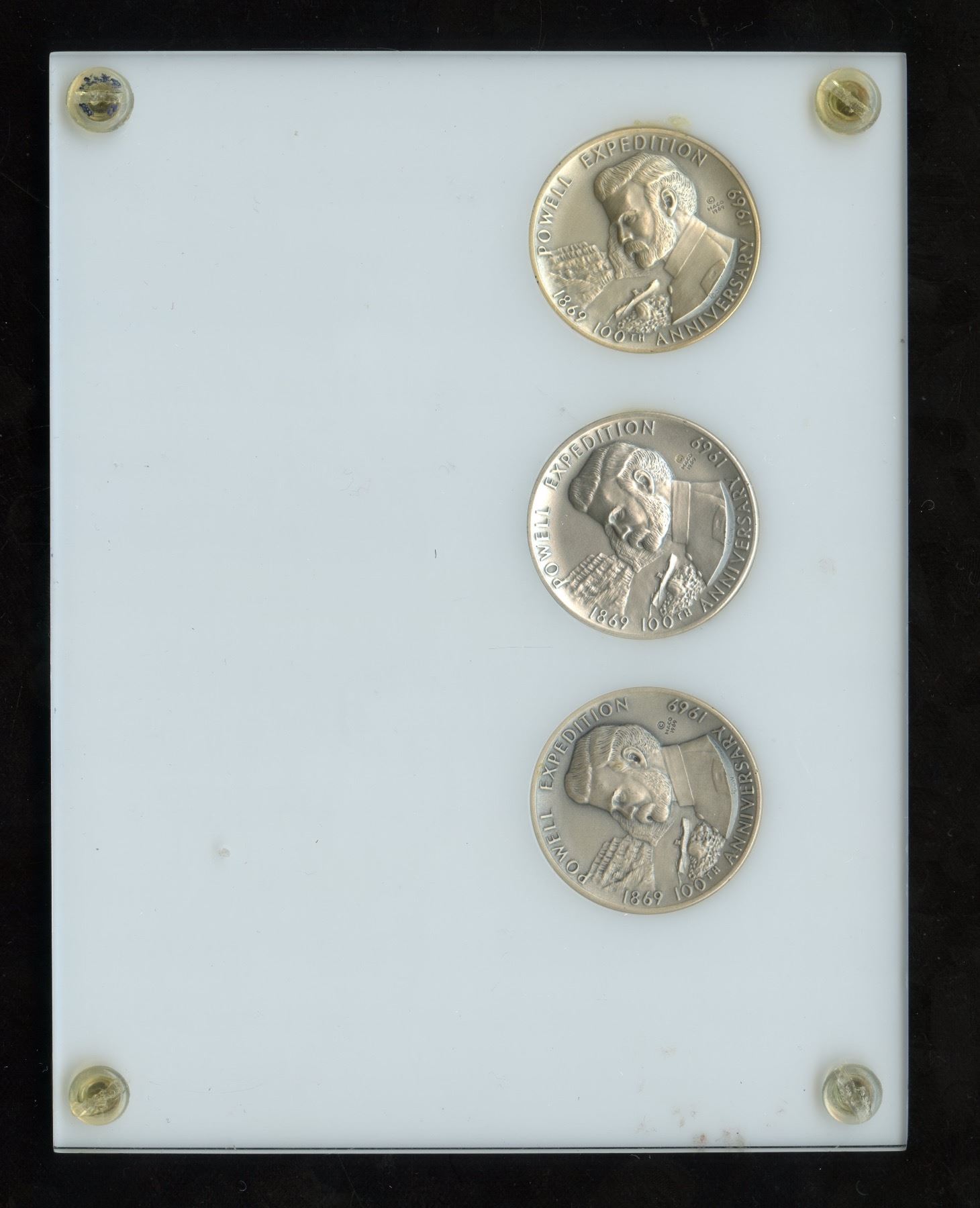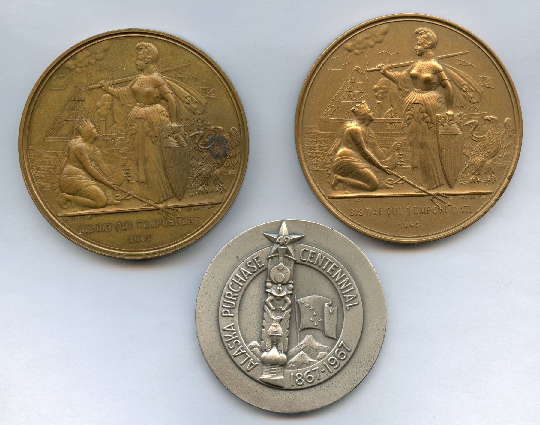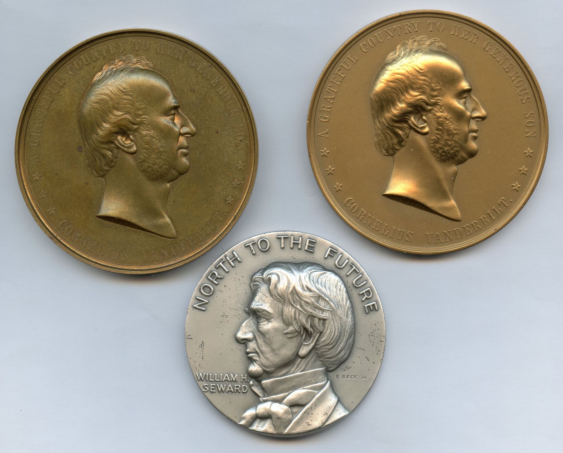 1.) 1865-dated Cornelius Vanderbilt medal in bronze (later restrike). 2.) Another example, but appears to be slightly earlier. 3.) 1967 William Seward Alaska Purchase medal by MACO in silver. 159.4gms. 64mm. 4.) Three Powell Expedition medals in custom Capital holder. 6 pcs.