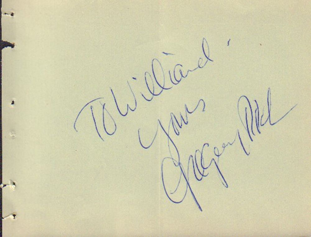 Autograph book page signed by Gregory Peck. It was inscribed to Willard. The page had been folded in half at some point. All items come with a certificate of authenticity good for the life of the piece.