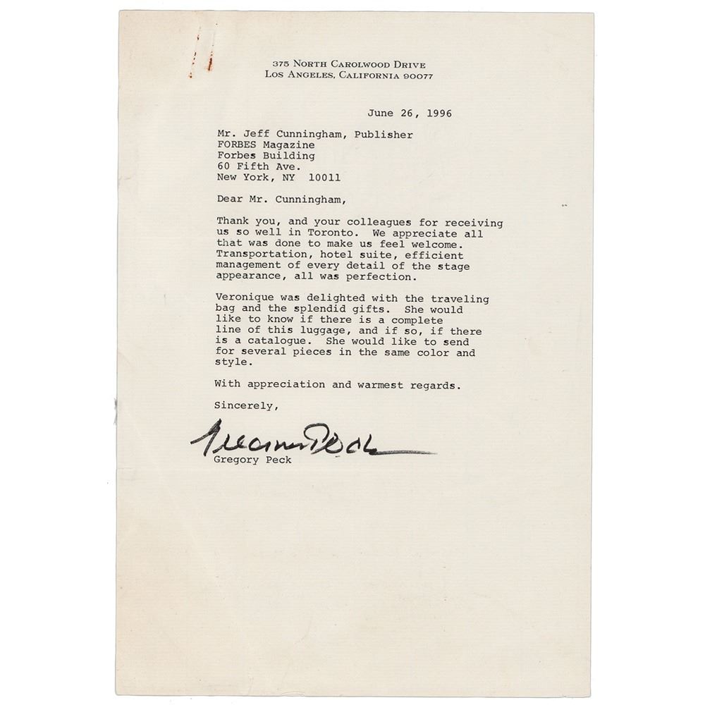 TLS, one page, 7.25 x 10.5, personal letterhead, June 26, 1996. Letter to Jeff Cunningham, publisher of Forbes Magazine. In part: "Thank you, and your colleagues for receiving us so well in Toronto. We appreciate all that was done to make us feel welcome. Transportation, hotel suite, efficient management of every detail of the stage appearance, all was perfection. Veronique was delighted with the traveling bag and the splendid gifts. She would like to know if there is a complete line of this luggage, and if so, if there is a catalogue. She would like to send for several pieces in the same color and style." In very good to fine condition, with light creasing, and a rusty paperclip impression to the top edge. Accompanied by the original mailing envelope.