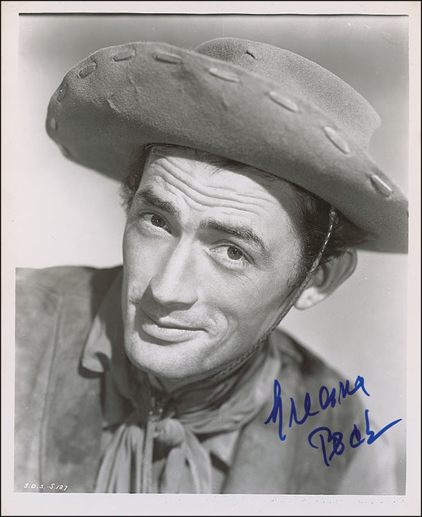 Glossy 8 x 10 photo of Peck from Duel in the Sun, signed in blue felt tip. Scattered surface impressions, mild creasing to the corners, and some light horizontal rubbing marks across the facial area, otherwise fine condition.