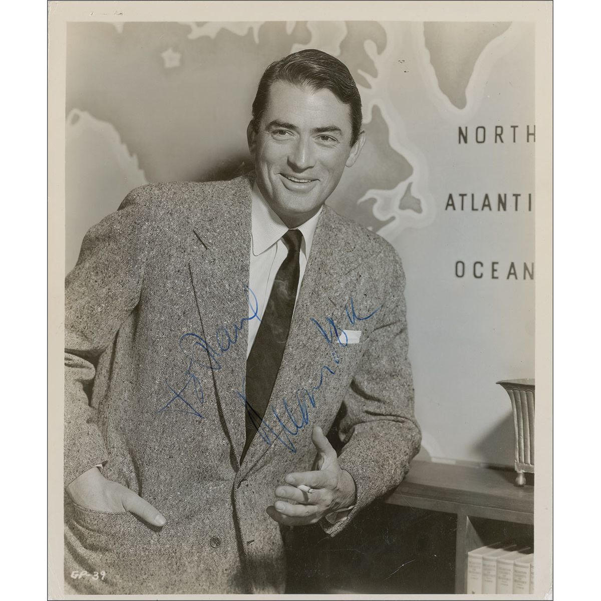 Vintage glossy 8 x 9.5 photo of the young and handsome actor, signed and inscribed in fountain pen, “To Paul, Gregory Peck.” In very good condition, with moderate surface creasing and marks, a staple hole to the top left corner, and some light contrast to the signature.