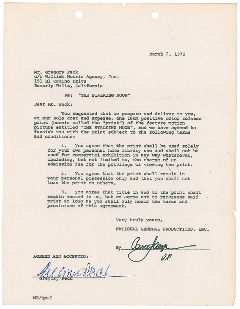 DS, one onionskin page, 8.5 x 11, March 2, 1970. Agreement between National General Productions and Peck, approving his request for “one 16mm positive color release print…of the feature motion picture entitled ‘The Stalking Moon,’” provided that it is not used for commercial purposes and remains in his personal library. Signed at the conclusion in blue ballpoint by Peck and black felt tip by a production company vice president. In fine condition, with expected document wear.