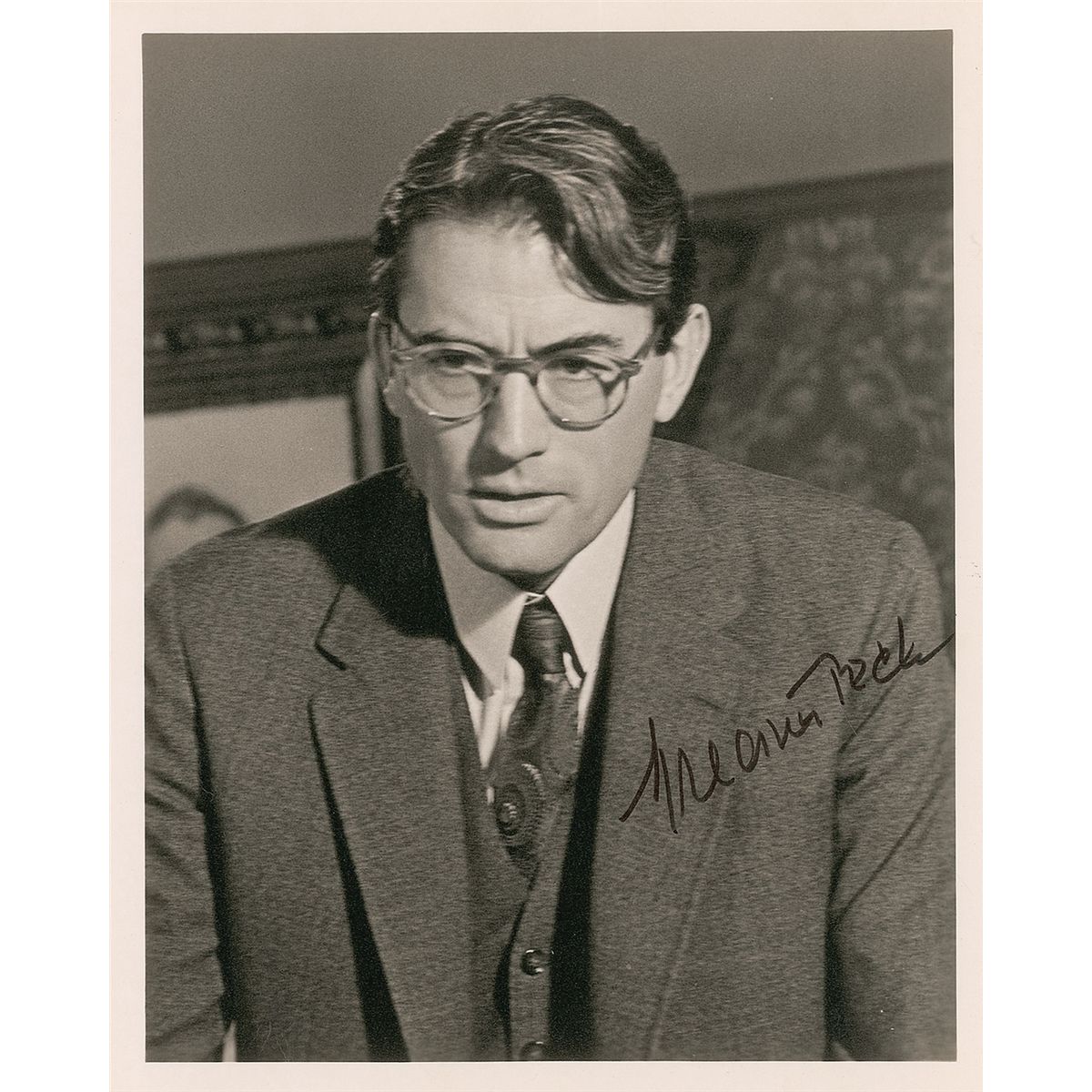 Matte-finish 8 x 10 photo of Peck in his Academy Award-winning role of Atticus Finch in To Kill a Mockingbird, signed in black felt tip. In fine condition, with some light rippling and creasing to horizontal edges and image just a touch fuzzy.