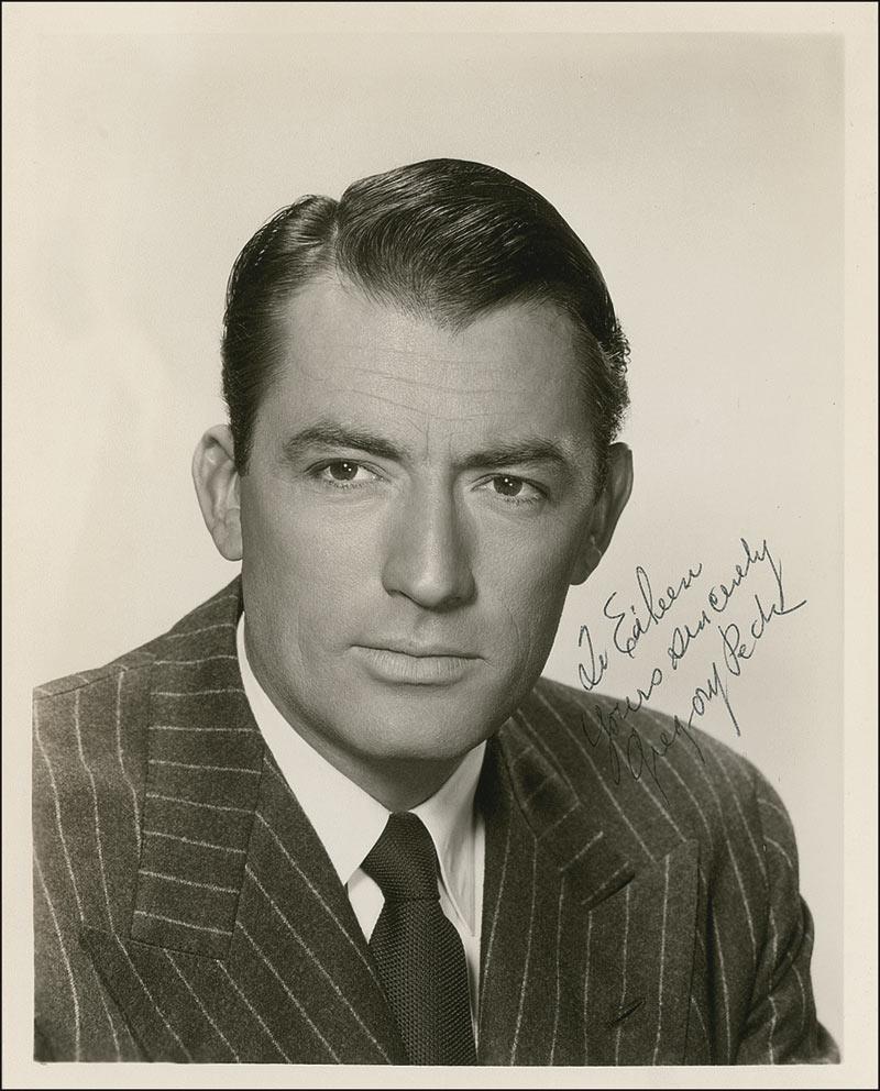 Vintage matte-finish 8 x 10 photo of Peck in a pinstripe suit, signed and inscribed in black ballpoint “To Eileen, yours sincerely, Gregory Peck.” In fine condition. Pre-certified PSA/DNA and RRAuction COA.