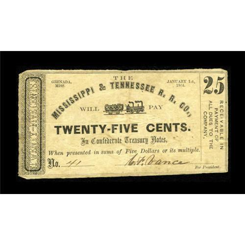 <B>Grenada, MS- Mississippi & Tennessee R.R. Co.</B></I> 25¢ January 1, 1864 Kraus 51970<BR> This note, which carries an R7 rating, retains some embossing. <B>Fine-Very Fine</B></I>.<BR><BR><b>Shipping:</b> Coins & Currency (<a target="_blank" href="http://www.heritageauctions.com/common/shipping.php">view shipping information</a>)