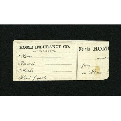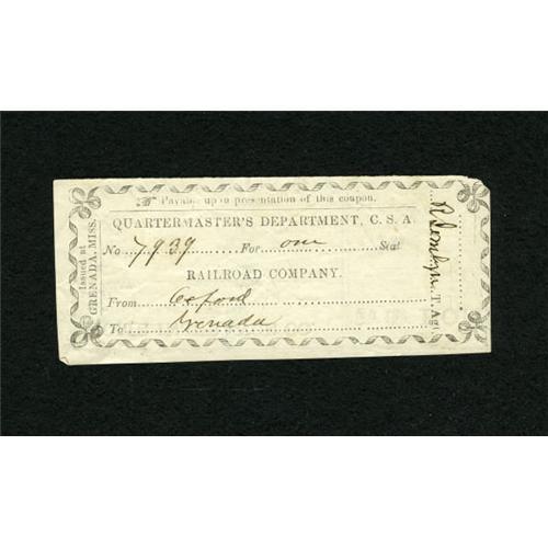 <B>Grenada, MS- Quartermaster's Department, C.S.A</B></I>. One Seat Undated<BR> This rare CSA Quartermaster's form, printed on recycled Home Insurance Co. of New York City paper, was for a Grenada to Giford (sic), Mississippi railroad ticket. The upper right corner shows rounding. <B>Very Fine,</B></I> once mounted with a stamp hinge.<BR><BR><b>Shipping:</b> Coins & Currency (<a target="_blank" href="http://www.heritageauctions.com/common/shipping.php">view shipping information</a>)