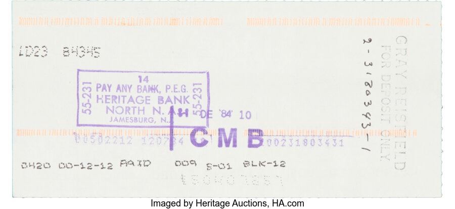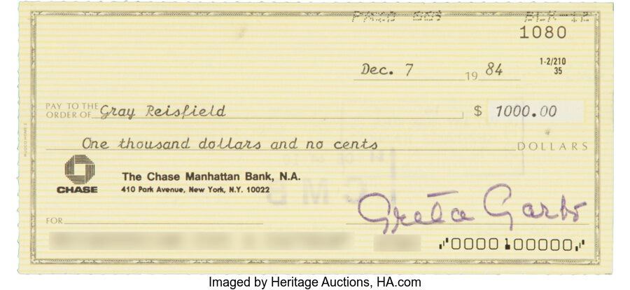 Greta Garbo Signed Check.A check signed in full by the screen star, composed in purple ink. Check is addressed to Garbo's niece Gray Reisfield for $1,000 in 1984. Measures 6" x 2.75". Cancellation stamp lightly touching signature, overall Near Fine condition. COA from Heritage Auctions.