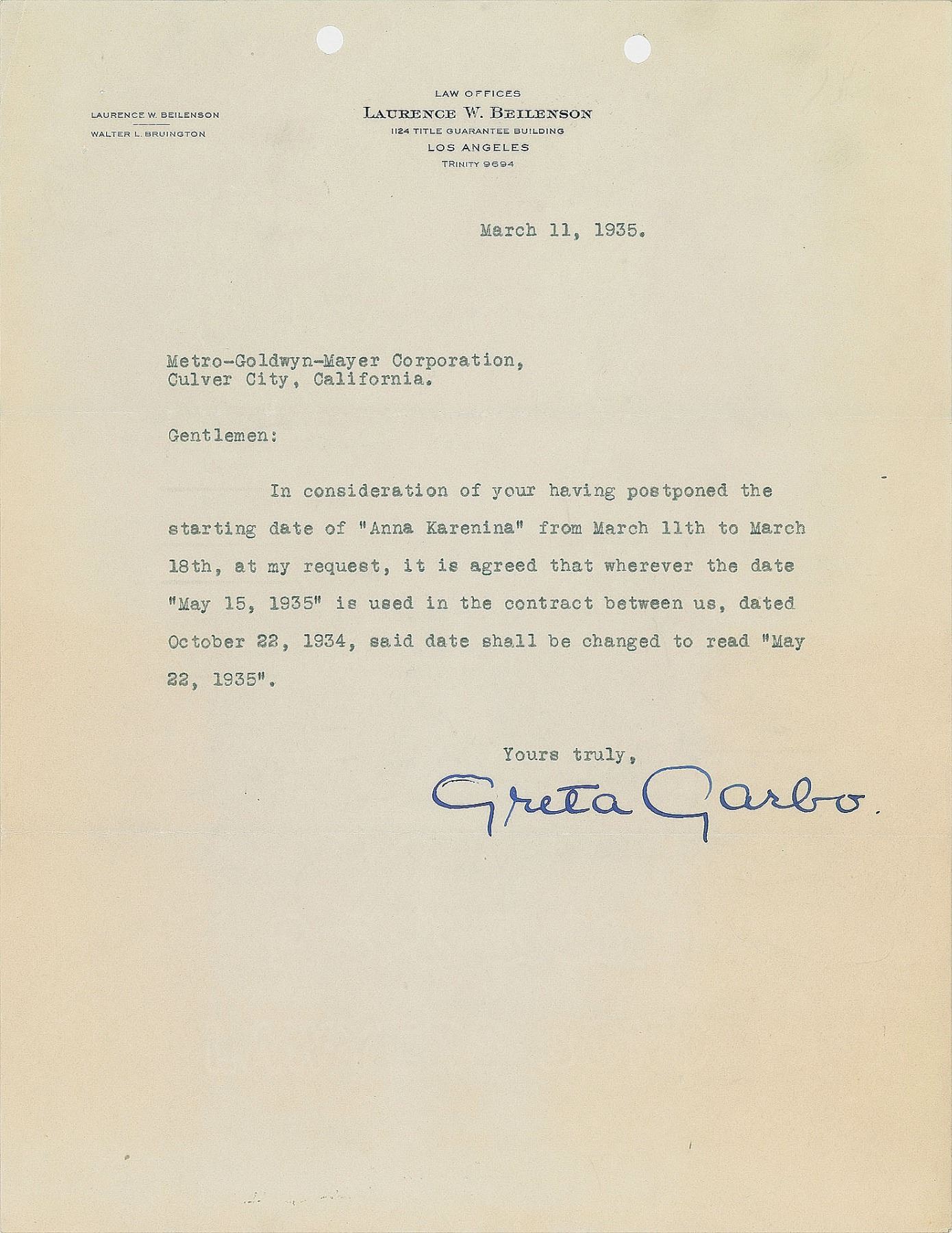 DS, one page, 8.5 x 11, Law Offices of Laurence W. Beilenson letterhead, March 11, 1935. Document submitted to Metro-Goldwyn-Mayer, in full: "In consideration of your having postponed the starting date of 'Anna Karenina' from March 11th to March 18th, at my request, it is agreed that wherever the date 'May 15, 1935' is used in the contract between us, dated October 22, 1934, said date shall be changed to read 'May 22, 1935.'" Boldly signed at the conclusion in fountain pen by Garbo. In fine condition.