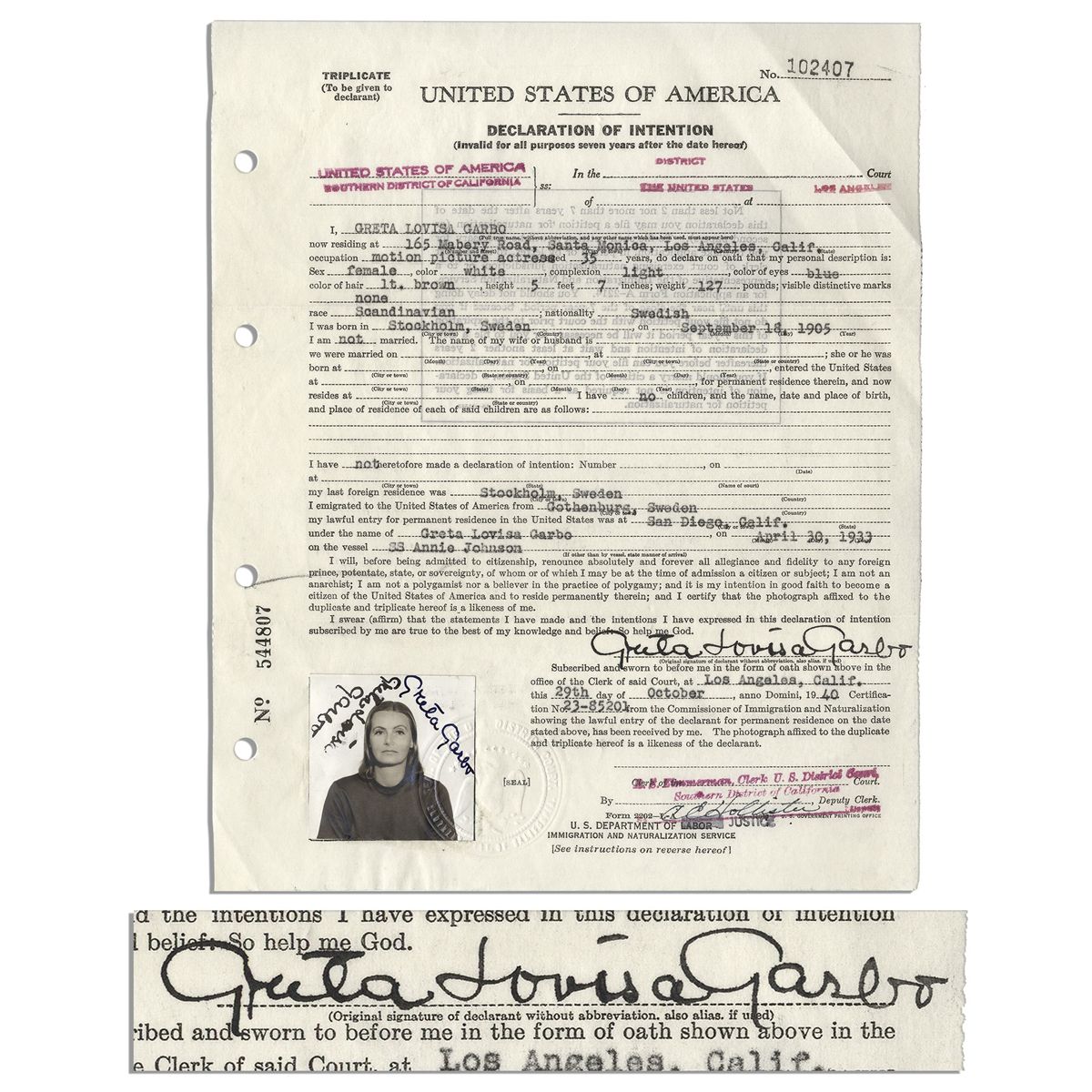 Original U.S. immigration and naturalization document thrice-signed by Greta Garbo, who was born in Sweden. ''Declaration of Intention'' document administered by the U.S. Department of Labor Immigration and Naturalization is dated 29 October 1940. Document details Garbo's intention to renounce her Swedish citizenship and become a U.S. citizen, listing her home address at ''165 Mabery Road'' in Santa Monica, her occupation as ''motion picture actress'', her age as 35, her height 5'7 and her weight 127 pounds. Typed document is signed with her full name, ''Greta Lovisa Garbo''. A black and white photograph affixed to the lower left of document is also twice-signed ''Greta Lovisa Garbo'' and ''Greta Garbo''. Single page document, front and verso, with U.S. stamp to verso measures 8.5'' x 10.5''. Four holes punched, two horizontal folds and minor toning. Near fine. From the estate auction of Greta Garbo by Julien's Auctions.