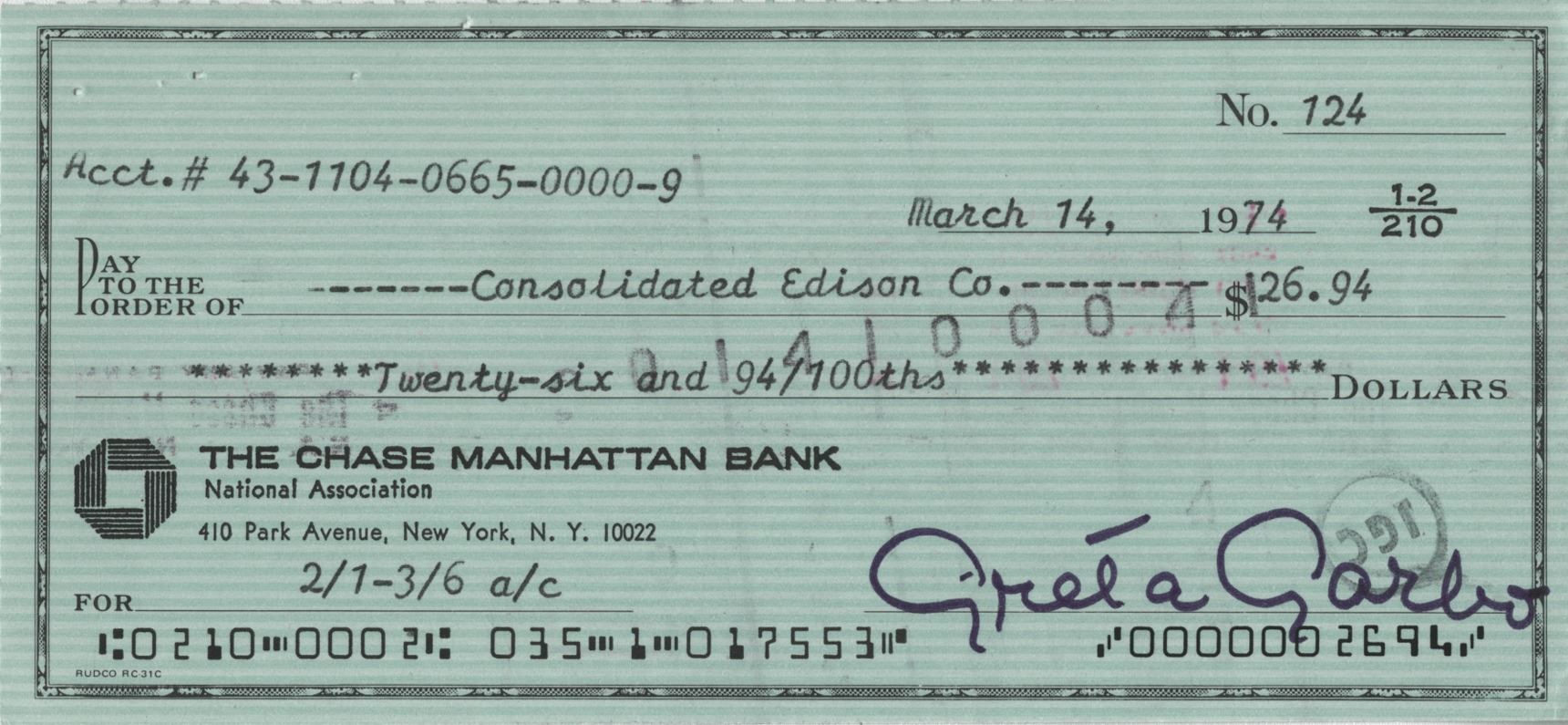63. Greta Garbo signed personal bank check. (1974) Vintage original 6 x 2.75 in. light green paper personal check from The Chase Manhattan Bank with clean edges, torn from a perforated checkbook. Typed payable to, "Consolidated Edison Co." for "$26.94", dated "March 14, 1974", signed in blue pen, "Greta Garbo" in space for signature. With characteristic bank ink stamps on front and verso and small staple holes in upper right margin. Exhibiting minor age and handling. In vintage fine condition. $800 - $1,200