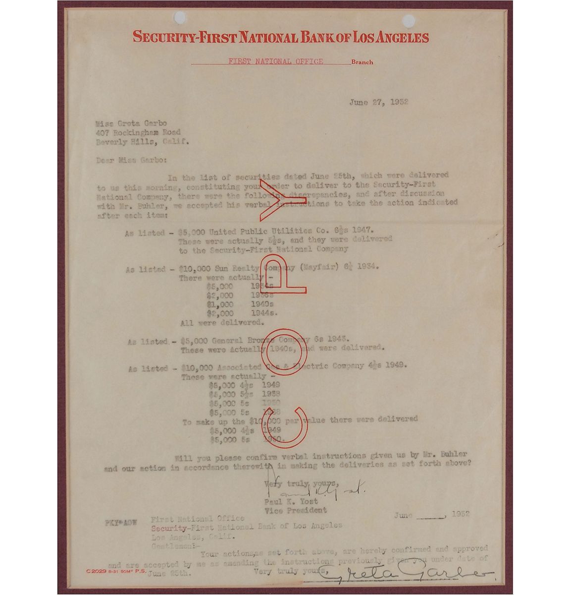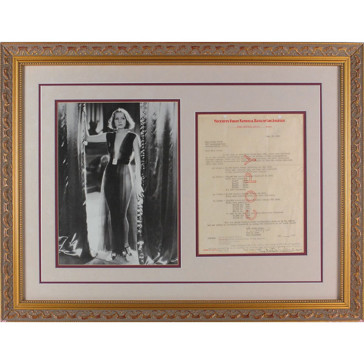 DS, one page, 8 x 10.75, June 27, 1932. Financial document between Garbo and the Security First National Bank of Los Angeles, regarding discrepancies in the delivery of securities, mentioning “United Public Utilities Co.,” “Sun Realty Company,” “General Bronze Company,” and “Associated Gas & Electric Company.”Attractively double-matted and framed with a full-length photo to an overall size of 23 x 21.5. In fine condition, with expected document wear. Garbo was known as a savvy investor who made a fortune in real estate and other business ventures—not to mention her own frugality. Though she retired from film in the 1940s, early investments such as those described in this document sustained her for the rest of her life. Garbo is scarce in any format and this is one of just a handful of full, career–era documents were have offered.