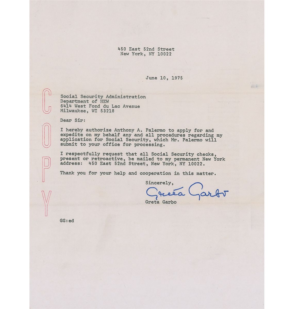 Boldly signed TLS, one onionskin page, 8.5 x 11, June 10, 1975. Letter to the Social Security Administration. In part: “I hereby authorize Anthony A. Palermo to apply for and expedite on my behalf any and all procedures regarding my application for Social Security.” In fine condition, with intersecting folds and overall wrinkling. Palermo first met Garbo in 1952 and they maintained a long friendship, with Palermo working as her financial advisor for a period of 20 years. Garbo is scarce in any form and this is an exceptionally clean, bold example.