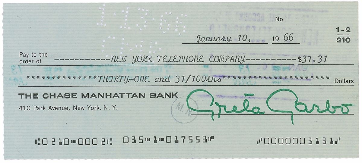 Chase Manhattan Bank check, 6.25 x 2.75, filled out in type and signed by Garbo, payable to New York Telephone Company for $31.31, stamp-dated January 10, 1966. In fine condition, with a vertical fold, and expected cancellation holes and bank stamps (one touching the first letter of the signature).