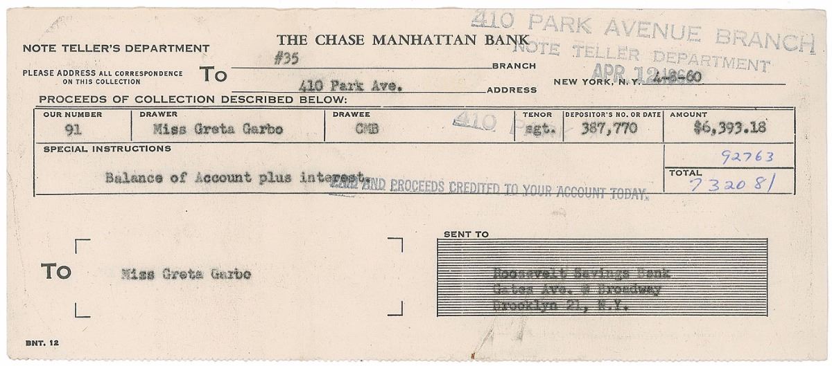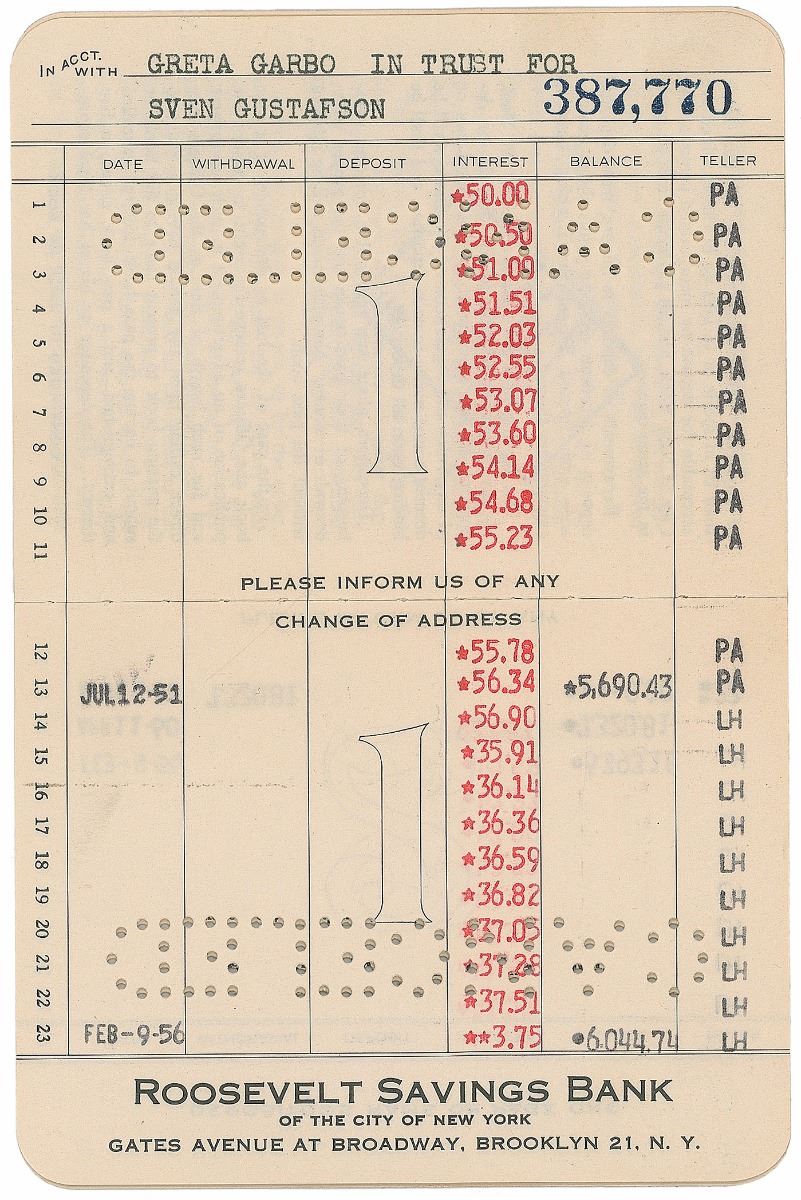 Unsigned passbook for an account Garbo maintained for her brother, Sven Gustafson, at the the Roosevelt Savings Banks in New York, six pages, 3.5 x 4.5, dated from July 12, 1951 to April 11, 1960. The first page is headed “Greta Garbo in trust for Sven Gustafson,” and three pages are filled out with financial transactions. Includes an unsigned carbon copy receipt noting her deposit of the same funds into an account at the Chase Manhattan Bank on April 12, 1960. In fine condition.